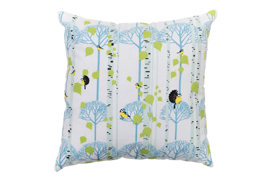 Mått: 45×45 cmFärg:Vit med träd- och fågelmotiv i grönt och blått