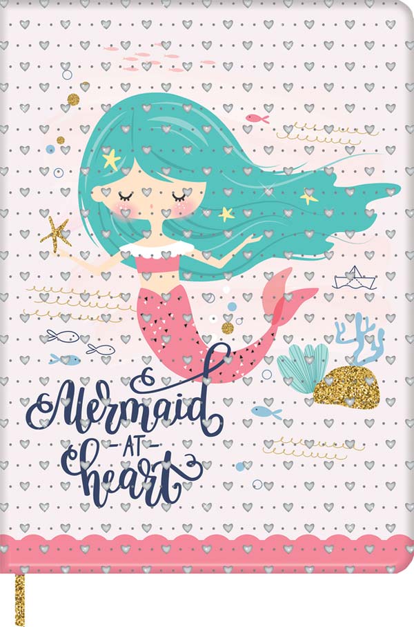 En vacker anteckningsbok med en fin sjöjungfru på framsidan med texten ”Mermaid at heart”. Anteckningsboken har enbart blanka sidor och inga linjerade sidor. Den har 190 sidor. Anteckningsboken har glittereffekt. Skriv ner dina hemligheter, tankar, lektionsanteckningar eller rita!