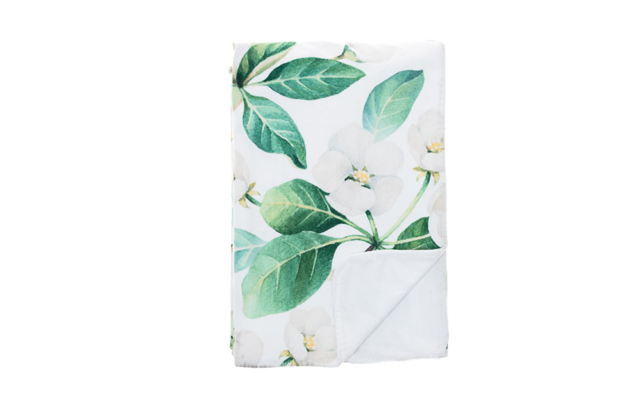 Apple FLowerfilten har blommönster på ena sidan medan andra sidan är enfärgad, med dubbla lager.