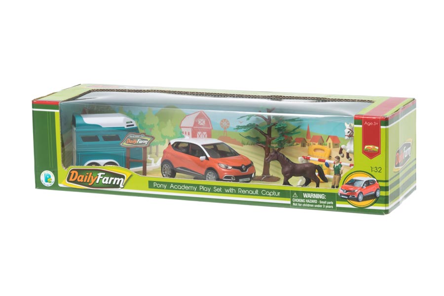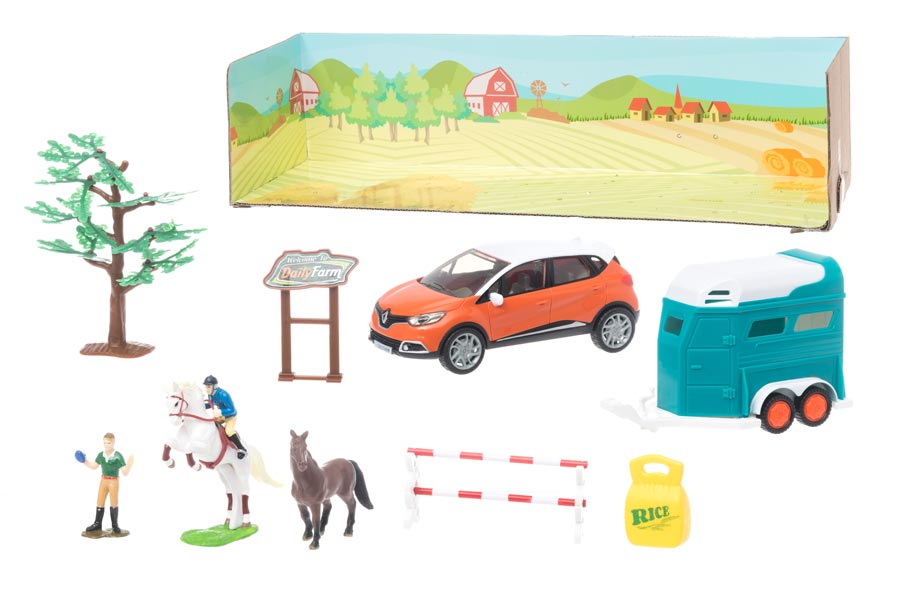En Ridskola med hästtransport med en Renault Captur Bil. I denna leksaksset så ingår det en hel del tillbehör, bland annat ett par hästar, skötare mm. Allt för att förgylla och ge ditt barn flera timmar av skoj, lek och uppmuntra till att utveckla sin kreativitet och fantasi.