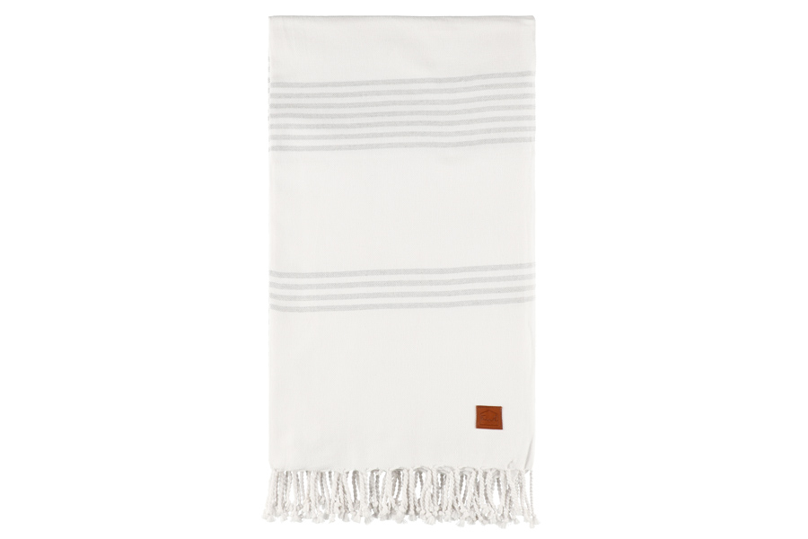 Tänk vad skönt att svepa in dig själv i ett gigantiskt badlakan när du är frusen och blöt. Detta stora stilrena badlakan med gråa linjer och vita fransar – passar lika bra på stranden efter ett dopp i havet som efter en snabb dusch hemma.