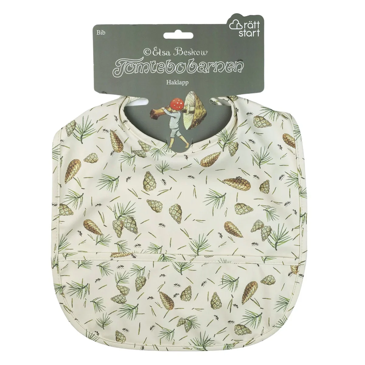 Denna praktiska haklapp ger ett effektivt skydd mot smuts och spill. Den har en framficka som fångar upp mat som annars skulle hamna på golvet och fästs enkelt i nacken med ett kardborreband.
