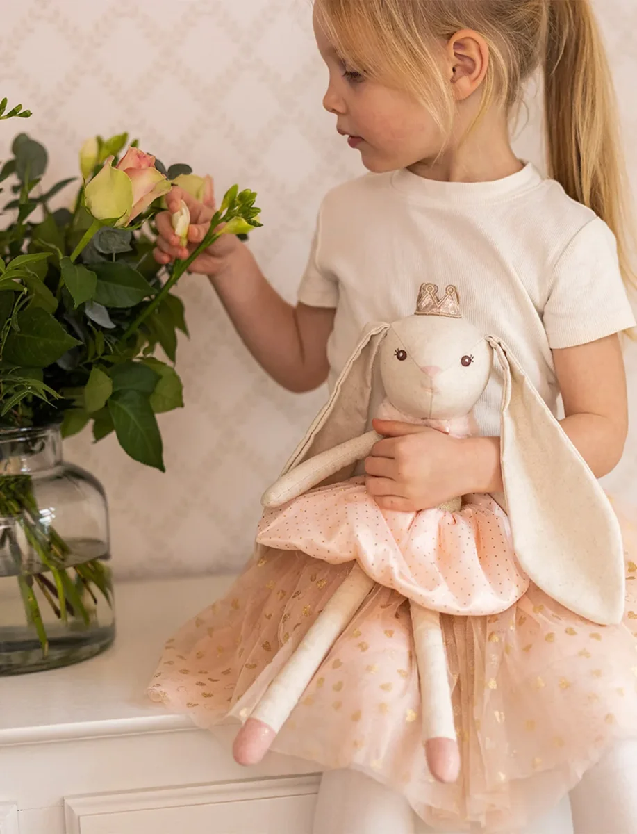 Möt Line, den charmiga kaninen med en mjuk och lekfull personlighet. Klädd i en vacker tyllkjol, pälsbolero och glittrande ballerinaskor är hon alltid redo för dans och äventyr. Den gnistrande kronan på hennes huvud ger en sagolik touch och lyser upp varje rum.